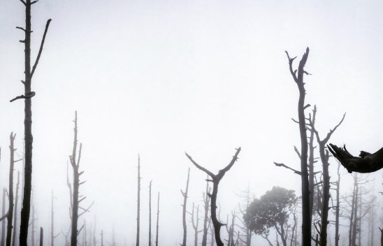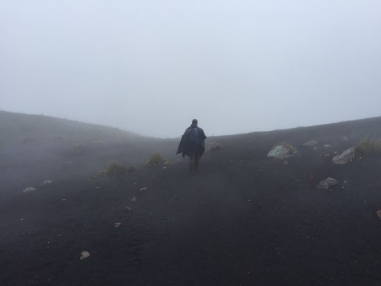 Déjà bien incliné, le sentier devenait extrêmement incliné. La forêt faisait place à une contrée d’arbres morts & de buissons. Le brouillard ne tardait pas à tout envelopper. À 3900m, nous étions désormais dans une contrée de sable volcanique où rien ne pousse.