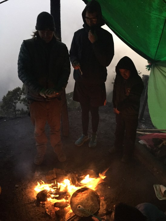 Le guide arrivait finalement avec sa demi-douzaine de clients. Au début, il nous regardait avec un regard qui voulait dire « foutez le camp », mais l’animosité disparaissait complètement à la minute où nous mentionnons être des guides volontaires pour Quetzal Trekkers. Nous allions passer toute la soirée avec eux… manger de leur nourriture… boire de leur chocolat chaud… sans rien payer.