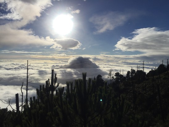 Le lendemain matin, lors de la descente (en prenant le bon chemin), nous avions droit à un splendide lever de soleil avec le Volcan Agua qui perçait une mer de nuage.