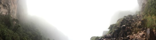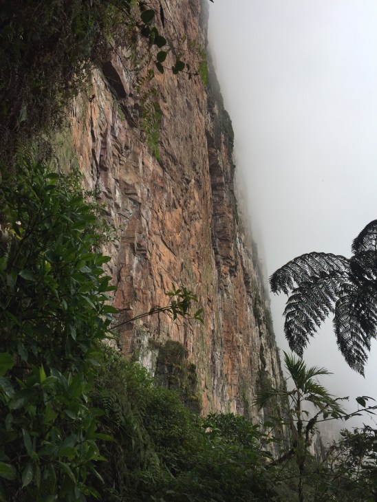Nous pouvions désormais toucher à la paroi. Il fallait avoir la tête extrêmement arquée vers le haut pour apercevoir le ciel tellement Roraima prenait tout l’horizon de droite à gauche et de haut en bas. La montagne avait constamment la tête dans les nuages, si bien que nous avions l’impression de monter au ciel.