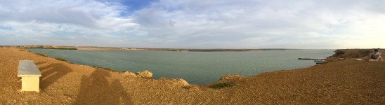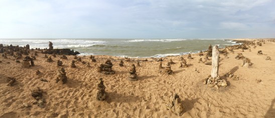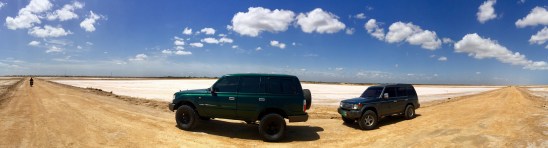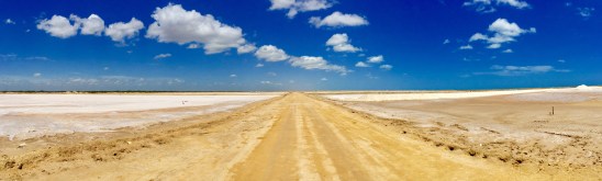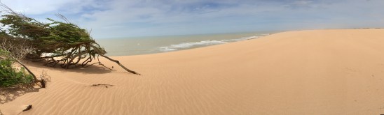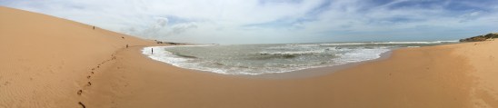 L’endroit offre un superbe panorama aux couleurs contrastée; le sable orange, des traces de lacs asséchés tout blanc (sel), un océan bleu azur et le ciel.